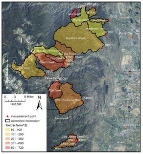 ABSTRACT: Flooding and erosion potential for the High Park, Black Forest and West Fork Complex wildfires, in Colorado, were modeled using the Natural Resources Conservation Service (NRCS) curve number (CN) and Revised Universal Soil Loss Equation (RUSLE) methodologies. The CN technique, implemented within HEC-HMS, estimated direct runoff from rain events for both pre- and post-fire conditions, to develop estimates of increased flood hazard and potential threat to life and property. A spatial version of RUSLE was developed to predict pre- and post-fire sediment yields for each 10×10 meter area for hydrologic flow paths connected to the burn area. The pre- and post-fire CN runoff and RUSLE sediment erosion estimates were summarized at strategically-located pour points within and downstream of the wildfire burn areas. Results were computed at 96 pour points for the High Park Fire (87,000 acres), 52 pour points for the Black Forest wildfire (14,300 acres), and 70 pour points for the West Fork Complex wildfire (109,000 acres). Post-fire conditions were simulated to result in 100-year floods from 10-year rainfall events in the most severely-impacted watersheds and up to 70 to >200 times of sediment expected on an annual basis. The results are most appropriately used in a comparative manner, between catchments.