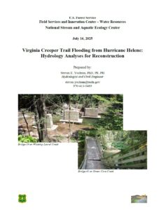 Yochum, S.E. (2025). Virginia Creeper Trail Flooding from Hurricane Helene: Hydrology Analyses for Reconstruction. U.S. Forest Service, National Stream and Aquatic Ecology Center, Project Report for the Jefferson National Forest, July 16, 2025.